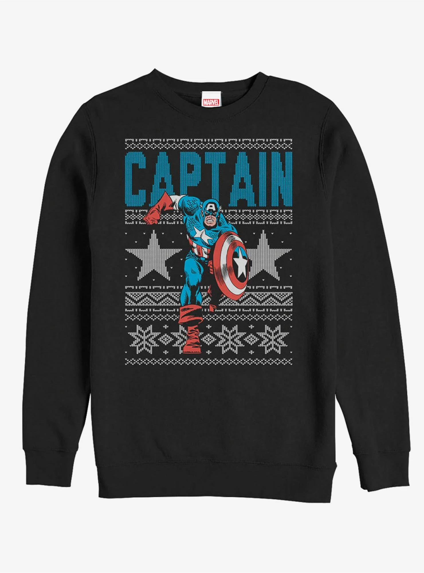 On the first day of Christmas, Marvel gave to me…a Marvel Captain America Star Ugly Christmas Sweater Black Sweatshirt! Start your holiday off right with this awesome black Captain America sweatshirt that portrays Steve Rogers framed by snowflakes in an ugly Christmas sweater style. 50% Cotton, 50% Polyester.