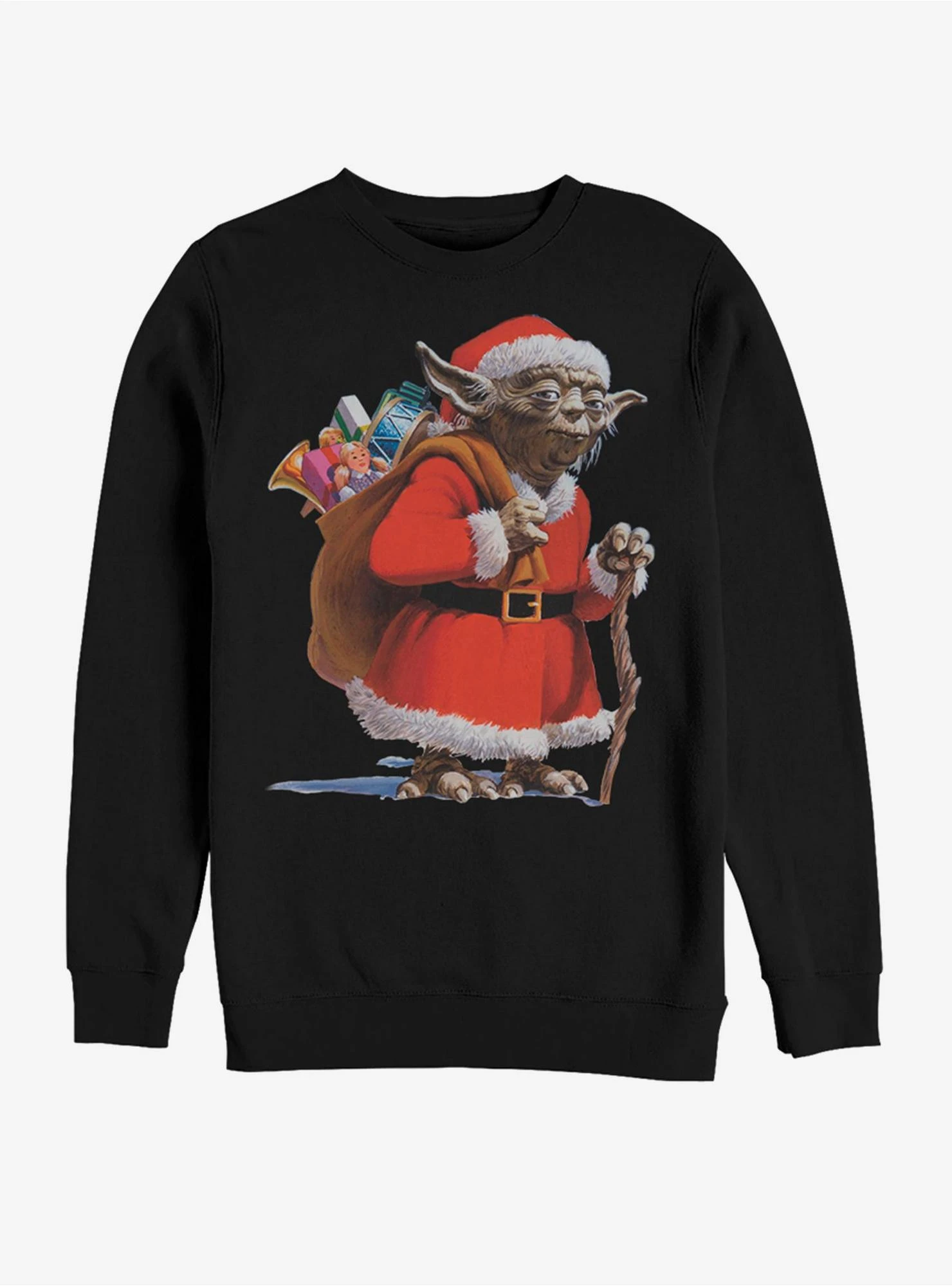 Naughty or nice have you been? Find out with the Star Wars Santa Yoda Black Sweatshirt. Yoda wears a Santa hat and coat with a bundle of toys on his back as he uses his walking stick to hobble across the front of this black sweatshirt. 80% Cotton, 20% Polyester.