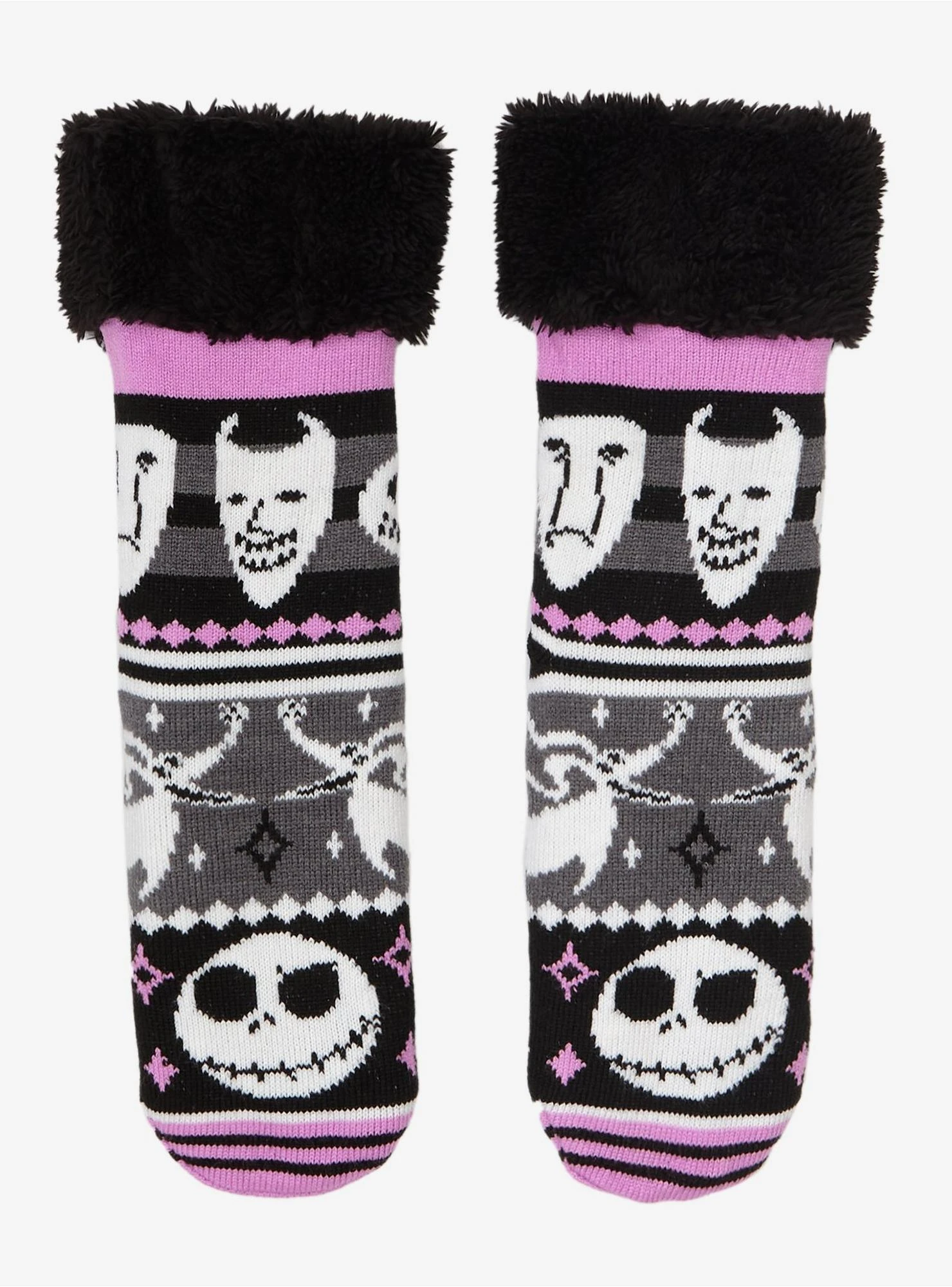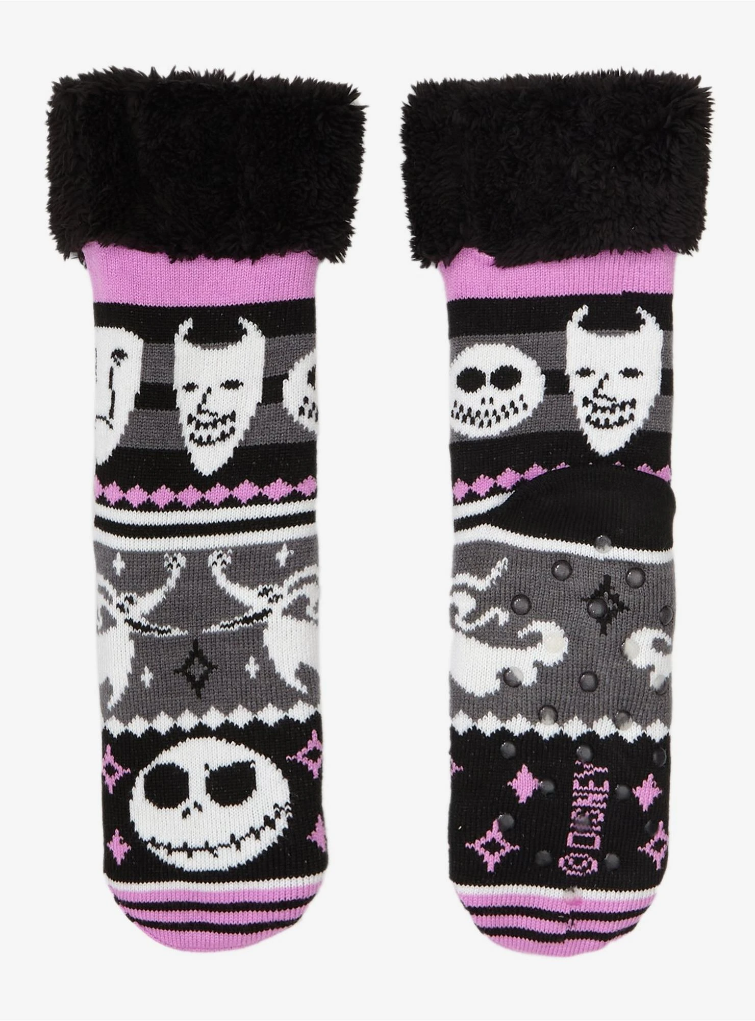 Wait for Sandy Claws with the coziest socks on! From The Nightmare Before Christmas, these fuzzy socks feature a Fair Isle-inspired design with Halloween Town’s citizens like Jack, Zero and Oogie’s Boys. Comes with black fuzzy lining and non-slip grips at the sole.