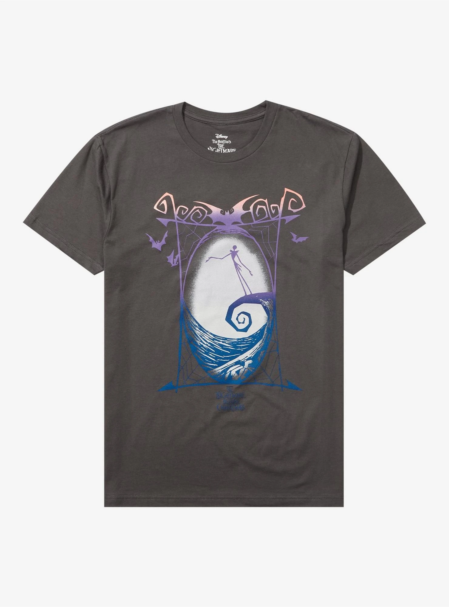 What’s this? What’s this? A bone-chilling tee is waiting for ya! Enter Halloween Town with this tee from The Nightmare Before Christmas, featuring an ombré depiction of Jack Skellington on Spiral Hill with a batty frame around him.